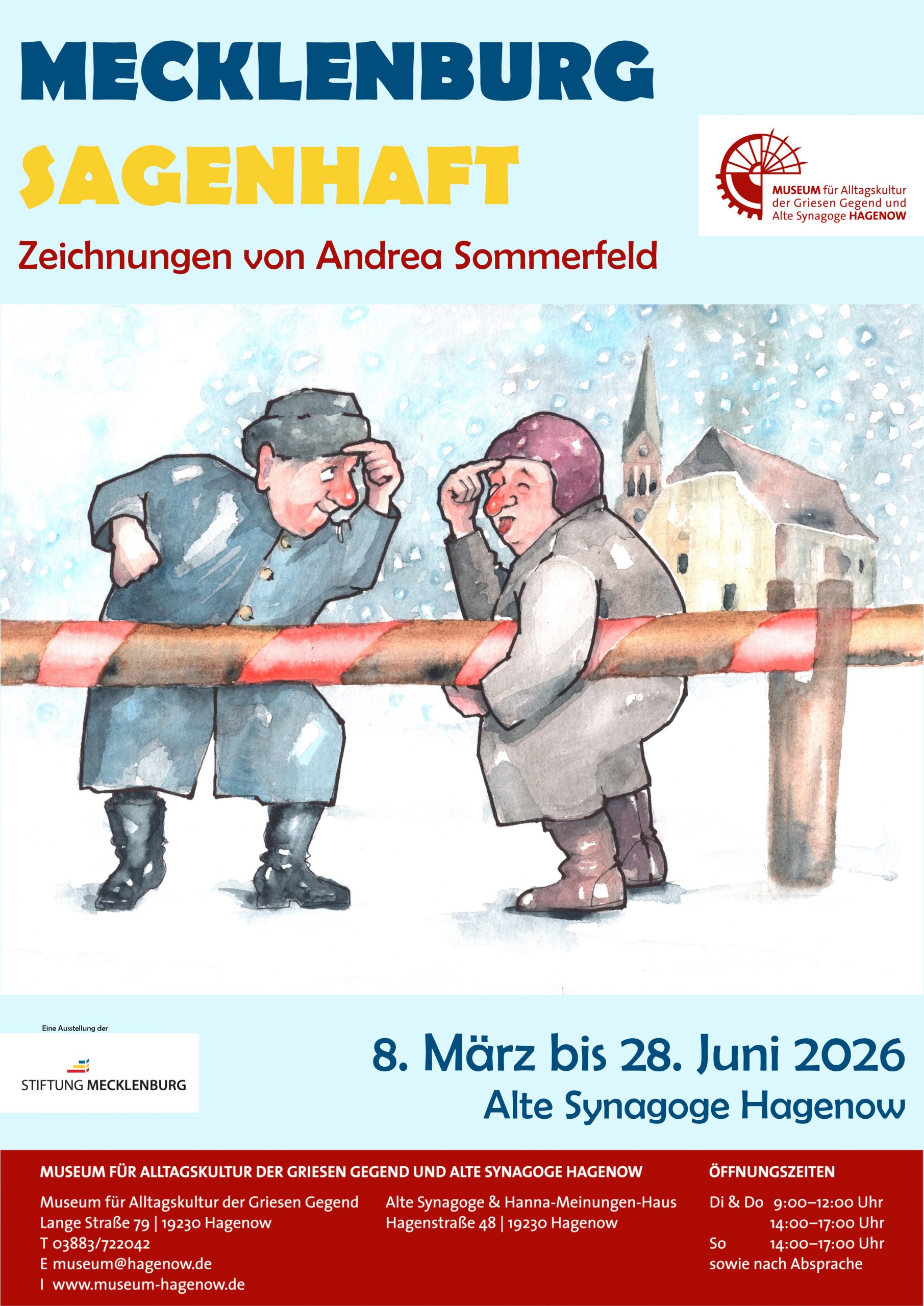 Am Sonntag, den 8. März 2026 wurde die Sonderausstellung „Mecklenburg Sagenhaft“ mit bunt-fröhlichen Illustrationen von Andrea Sommerfeldt in der Alten Synagoge eröffnet: Mutige Kinder, brotdumme Bösewichte oder Kanonenkugelkegeln – die hiesige Sagenwelt hat es in sich. Die Ausstellung zeigt rund 30 Aquarelle der Grafikerin aus Rostock (früher Güstrow) zu ausgewählten Überlieferungen dieses Schatzes. Sie illustriert regionale Sagen, setzt sie mit gekonntem Strich um und bringt den Kern der Erzählungen mit einem Augenzwinkern auf den Punkt.