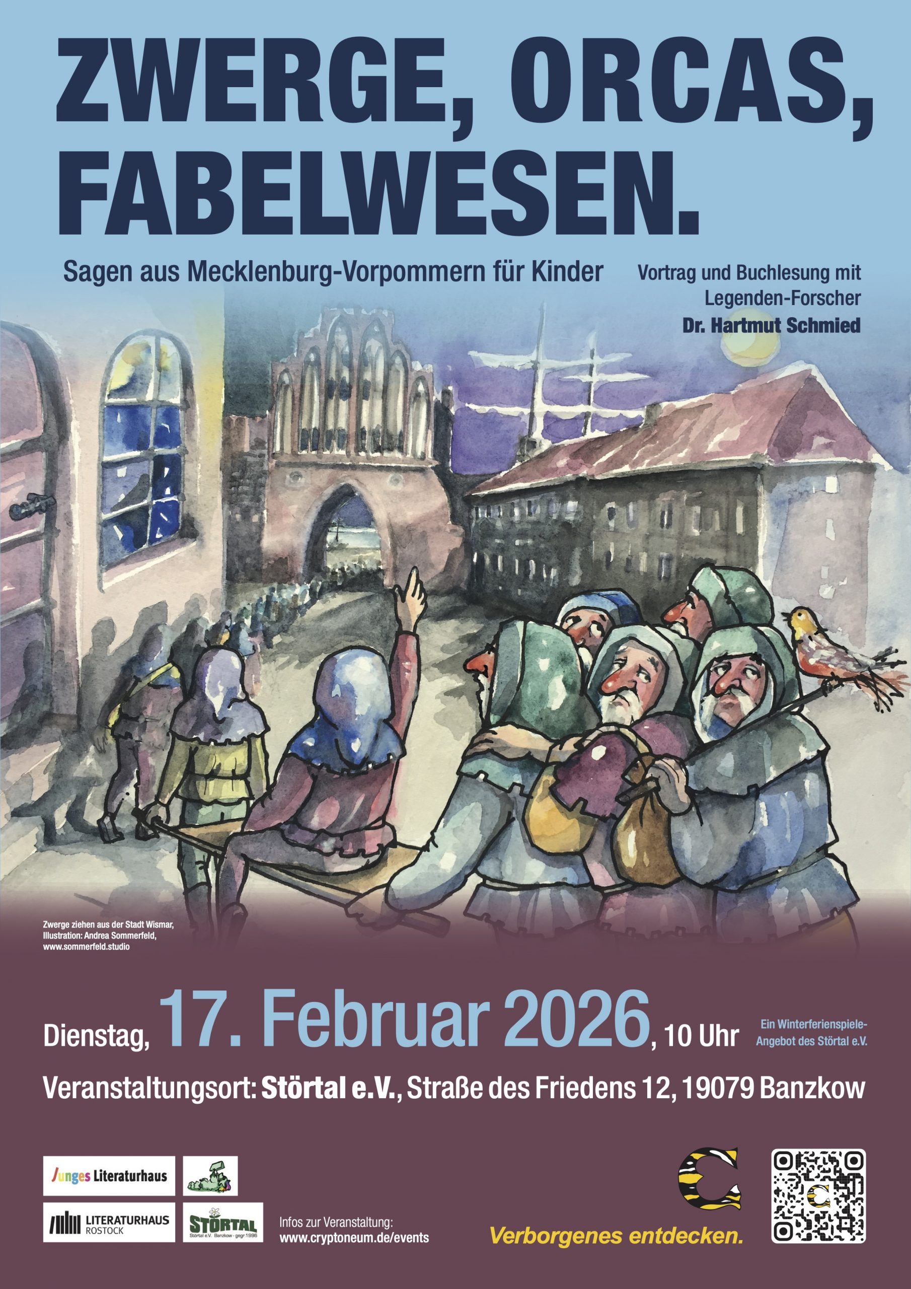 Dieser Vortrag möchte Schüler innerhalb der Ferienspiele motivieren, sich mit der Sagenwelt der Heimat zu beschäftigen. Natürlich geht es um Greife, Burgen und eine Wundereiche sowie um Riesen, Zwerge und Fabeltiere aus dem alten (Vor-)Pommern sowie aus Mecklenburg. Das etwa sind auch die Titel von zwei Sagenbüchern, die der Legenden-Forscher Dr. Hartmut Schmied aus Rostock extra für Kinder geschrieben hat. Für die Erwachsenen gibt es kulturgeschichtlich weiterführend dazu passend das Sagenbuch „Geister, Götter, Teufelssteine“ für ganz MV von Hartmut Schmied.